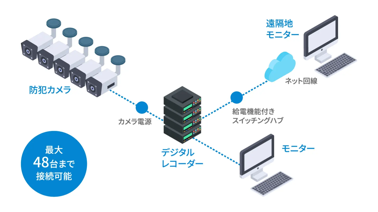 ご利用施設の状況に合わせて最大48台までのカメラを接続、インターネット環境を利用し、