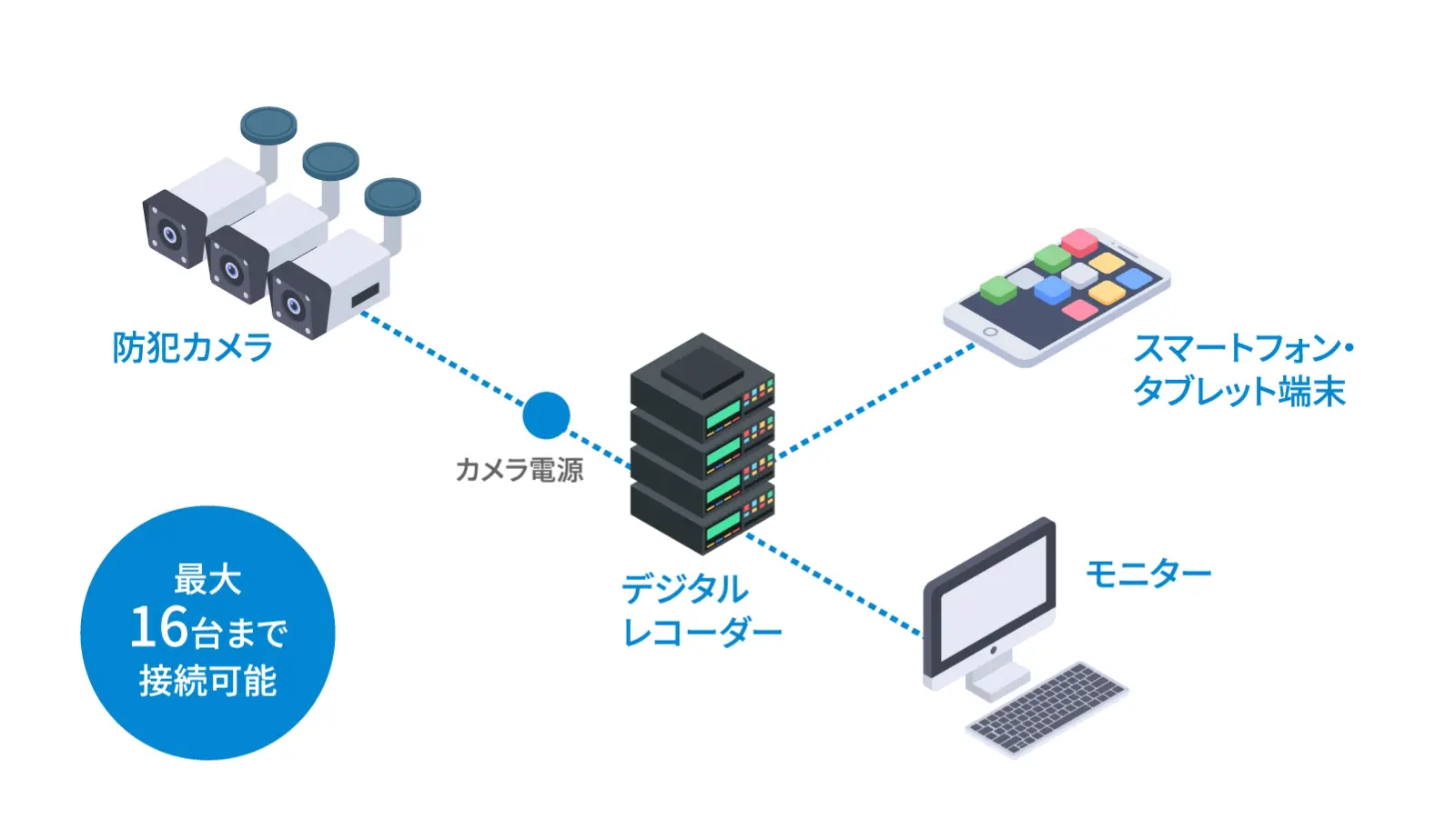最大16台までのカメラ接続ができます。既存のアナログカメラ機器も流用可能。